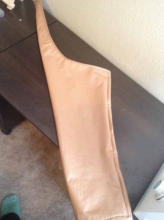 Chaps: This was a fun endeavor [insert sarcastic eye roll]. For the life of me, I could not find a pattern for cowboy chaps. Seriously, none. Instead, I modified my legging pattern. I found a reddish-brown vinyl that was decently priced for this. The pattern I used is designed for stretch fabrics, so my initial cut was a little small, particularly around my ginormous calves. I cut out long strips for the inside to accommodate. The sides of the chaps were extra long and I flipped them over to make belt loops. I used the remaining fabric for arm accessories.
