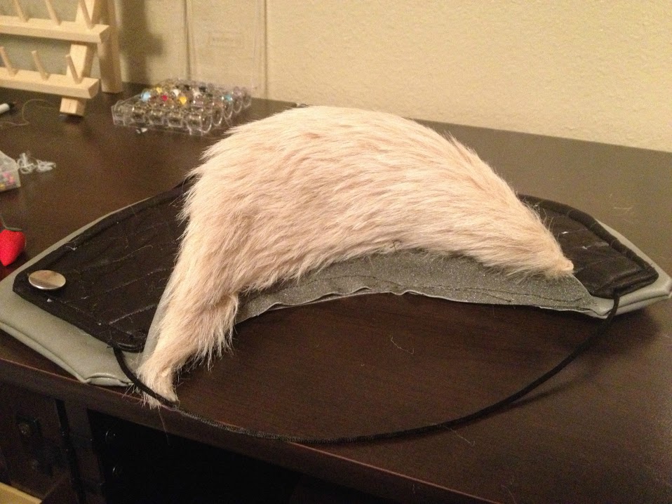 For the fur flap, I carved a mini-arc out of the remaining vinyl and sewed some fur trim to the underside. After putting in a few stitches to the vest to keep it all in place, I attached the fur piece to the inside of the neck and voila! I did put in some batting to give the neck some volume.