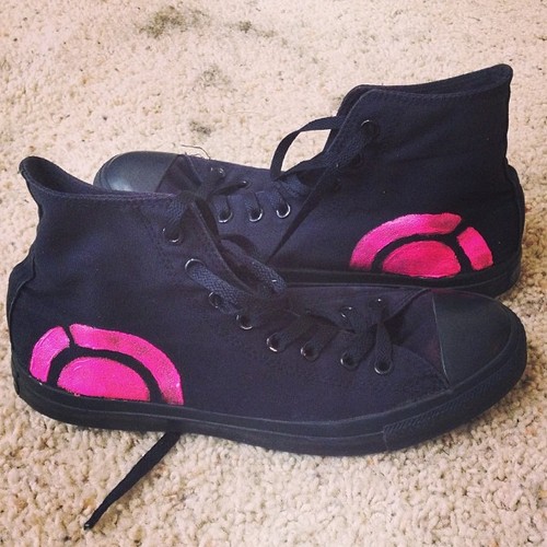 I found the shoes on eBay and used some fabric paint from Jo-Ann’s to make the Pokeball. I didn’t realize this at the time, but the paint has glitter in it!