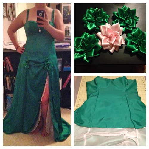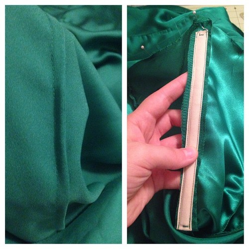 A little behind the scenes of my WIP. Bottom left is my lining layer. I used green satin until the pattern started flaring out at the hips, then I used chiffon for the skirt portion.