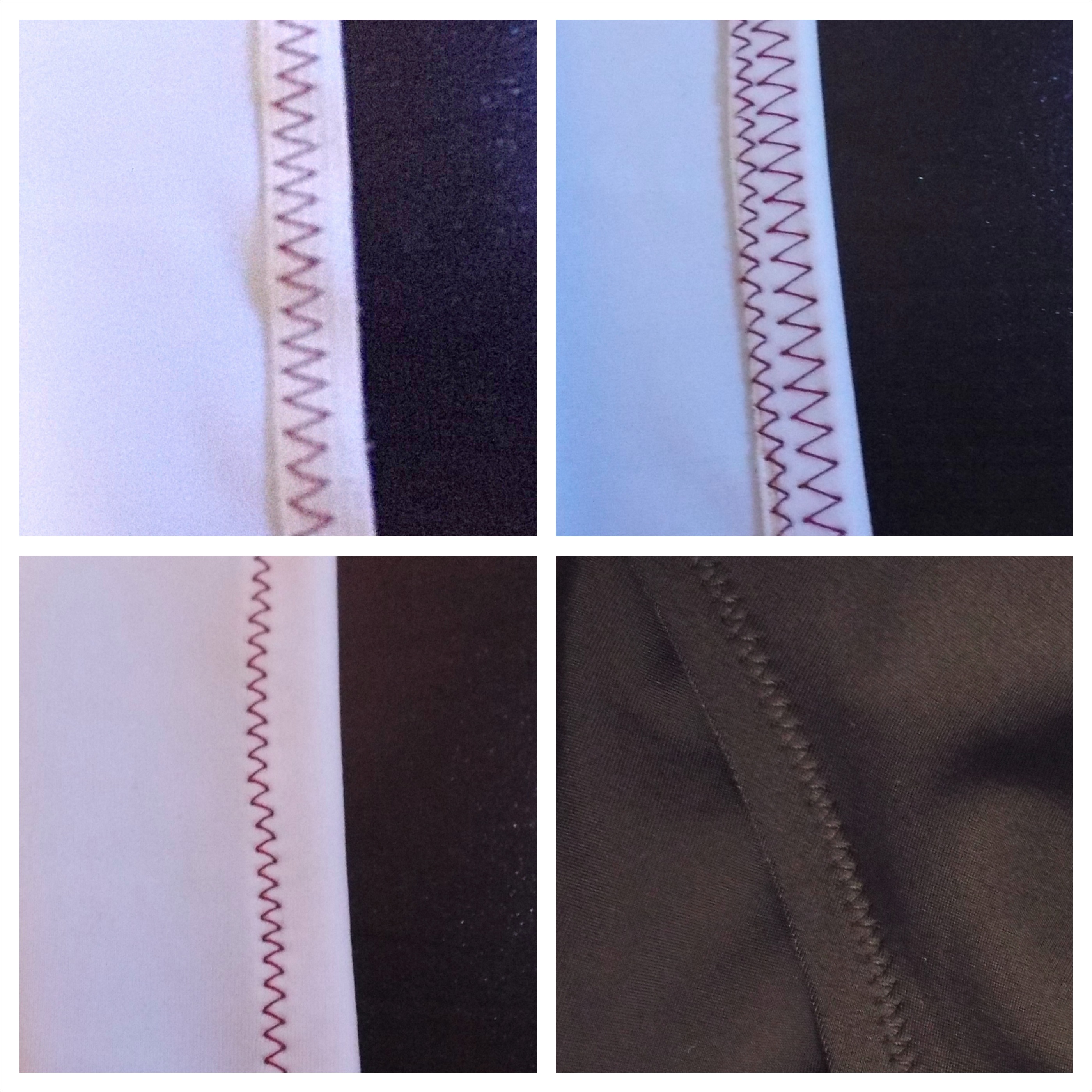 The top two images are the front and back sides of a stitch with a twin needle. The top side is straight and the back has a zigzag to it, which allows the stretch. Bottom left is a basic zigzag, which I used on my Lady Skater. Bottom right is Supergirl. I used bands from my Renfrew to finish the sleeves.