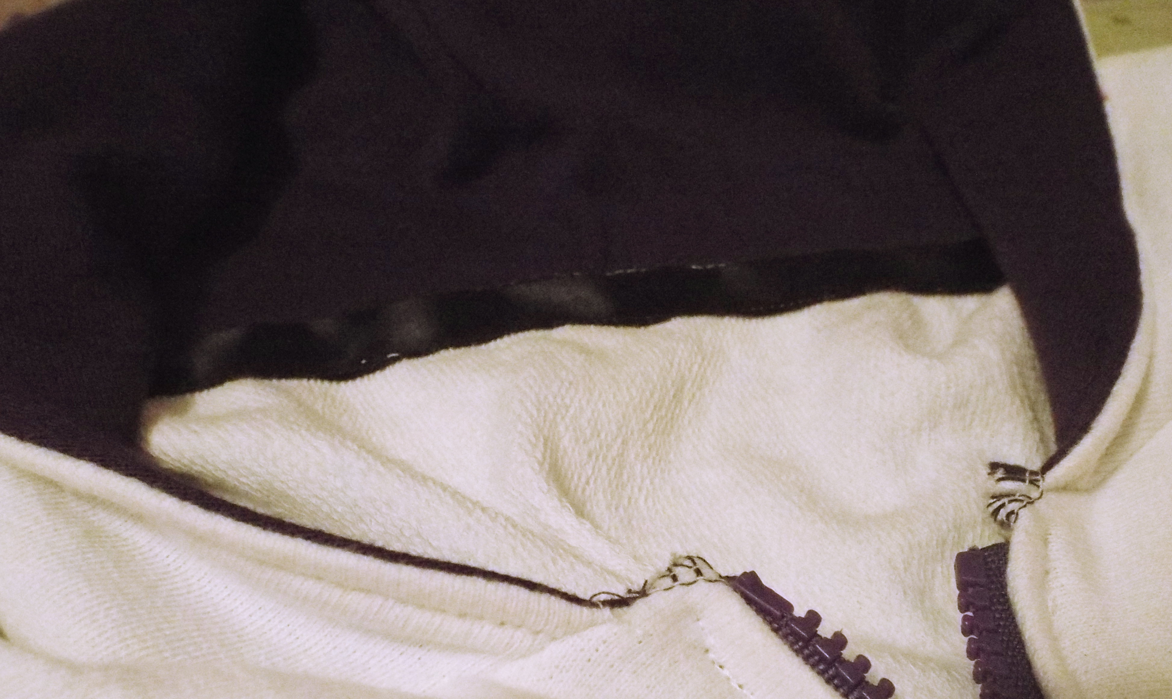 Other thoughts: I adore this hoodie. It’s very happy making. I don’t think I’ll make another one for myself (though if someone wants one, I’d be happy to take a commission!), but if I did, I’d make the ears a little smaller and add interfacing to keep them up. The terry really didn’t want to stay up, but the fleece helped with that. I’d also add the ribbon all around the neckline prior to adding the zipper for a cleaner finish.