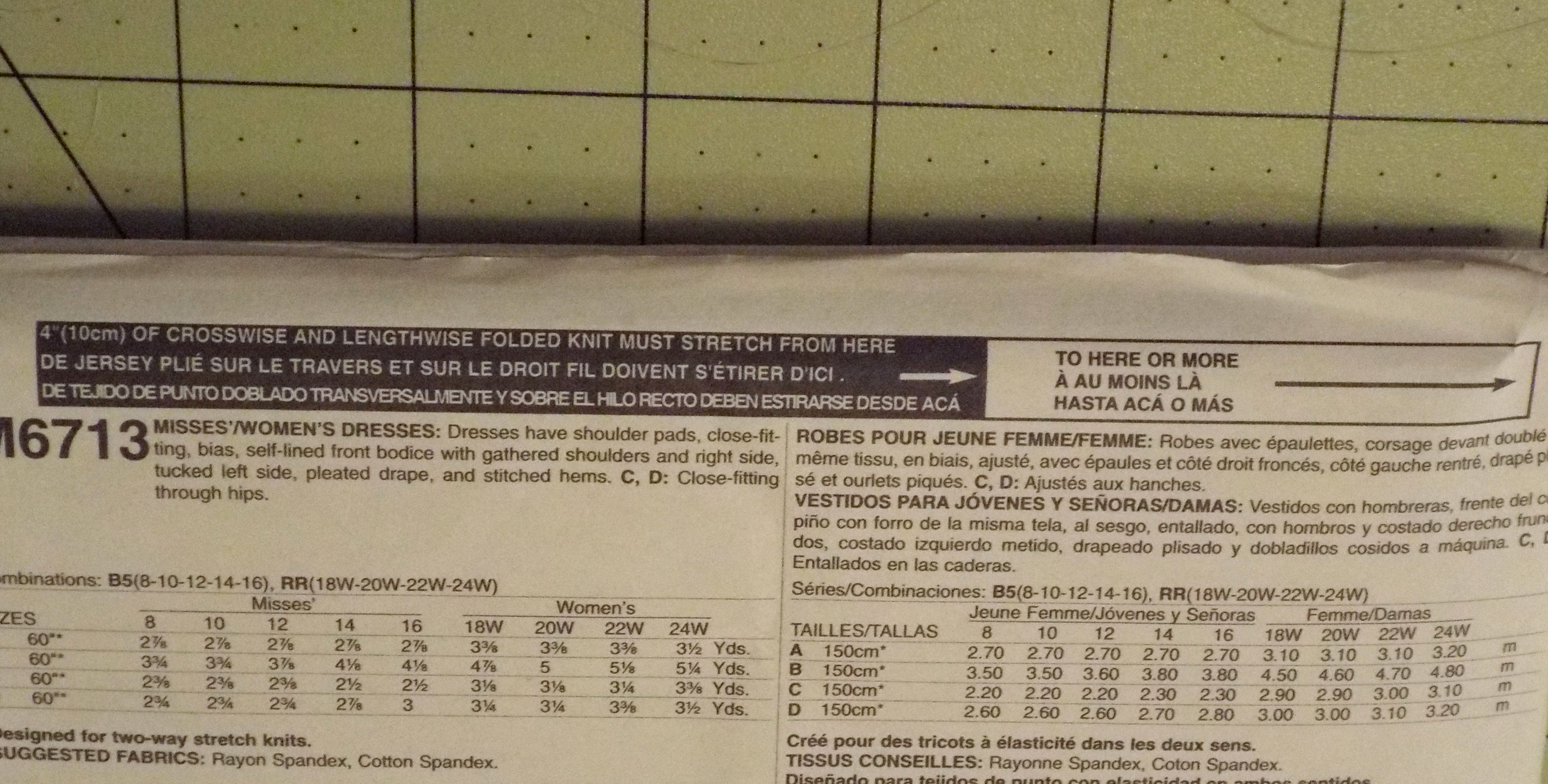 - Pattern number, which you’ll need to retrieve a pattern from the drawers in a fabric store. In this case, M6713.