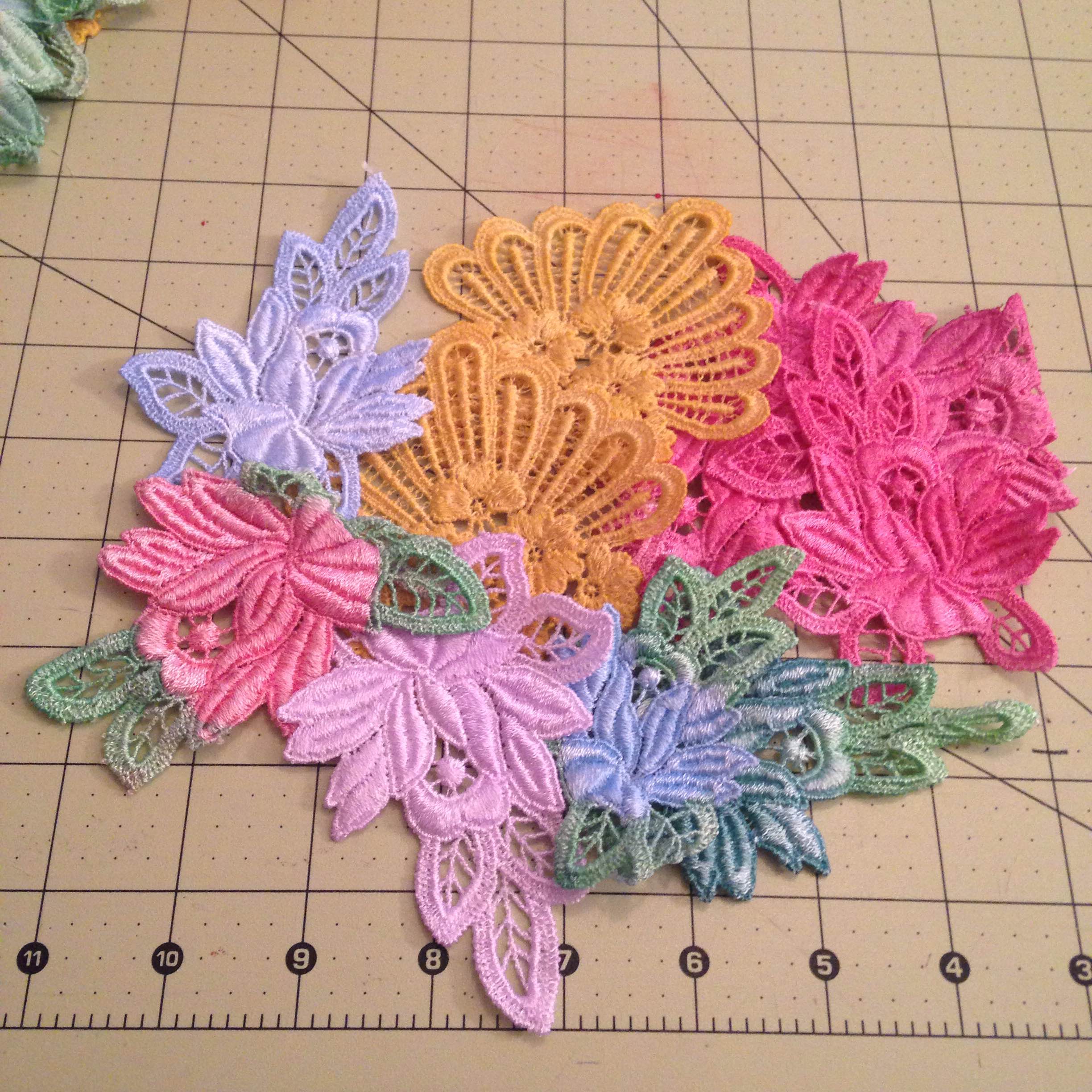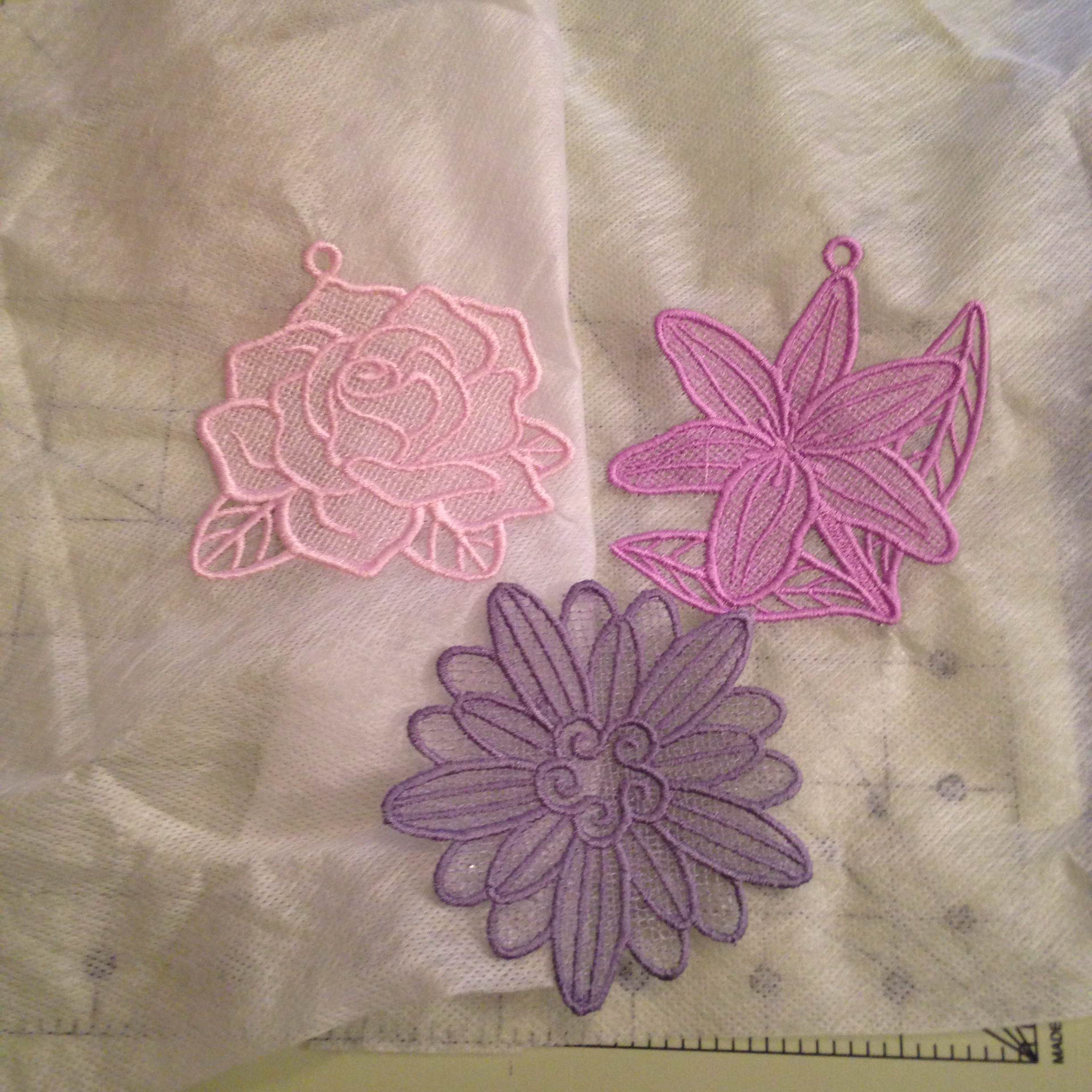 I created several more pieces by using lace embroidery pieces available from emblibrary.com. This is such a cool technique. You “embroider” the lace pieces on water soluble stabilizer, then drop the finished piece in a basin of water. Once the stabilizer has dissolved, you iron the final piece and are left with a gorgeous lace flower. These are intended as coasters and Christmas ornaments, but they work perfectly as filler pieces for Lulu.