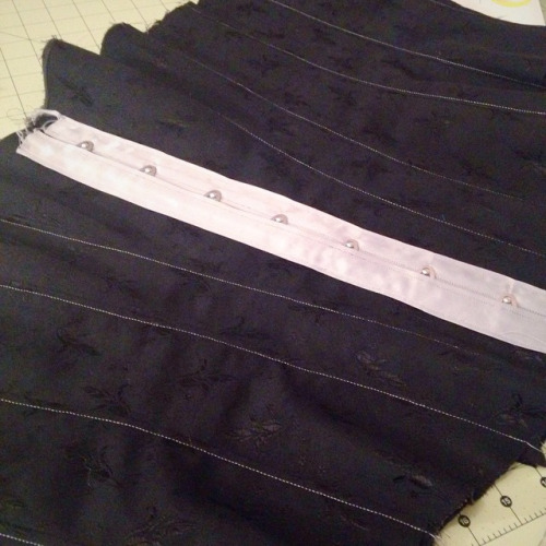 One of my bigger challenges with this corset was adding the binding around the busk. Inserting a busk requires precision, and I had to add the satin binding to my coutil layer before I could construct the busk pocket. I drew in all my seam allowances with tailor’s chalk and went VERY slowly with the whole process. Once I had my hook side inserted, I stitched it down, and then brought my binding over and stitched that down as well. Unfortunately, my initial measurement of 1″ faux boning channels was far too wide for my taste, so I had to seam rip it up and reduce it to 5/8″.