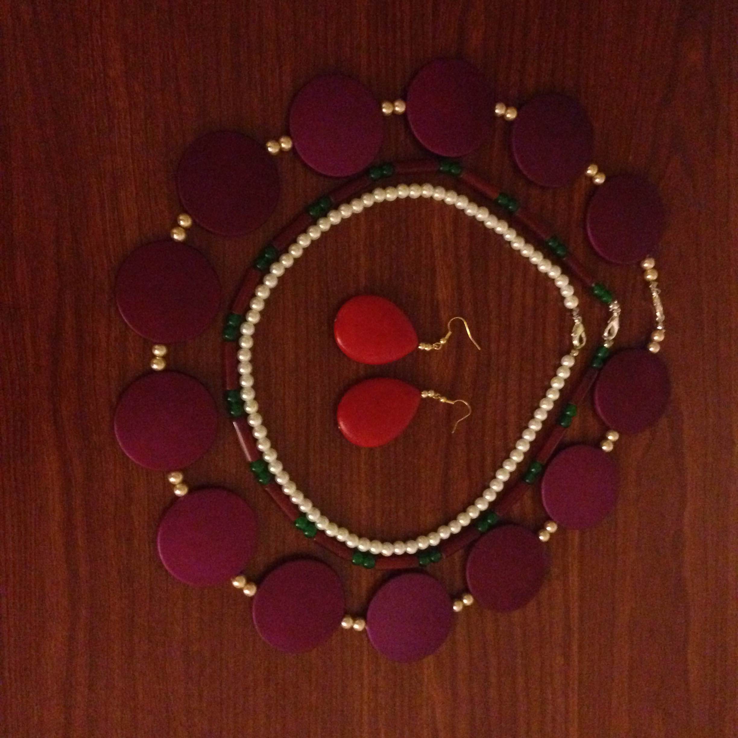 For the largest necklace, I snagged some rubber purple flat circles off of eBay. They’re separated by ivory faux pearls from Michael’s. The middle necklace is made from red jade cylinder beads and dark green jade beads I found on Etsy. The shortest necklace is made from faux pearls from Michael’s. All the necklaces close with lobster clasps.