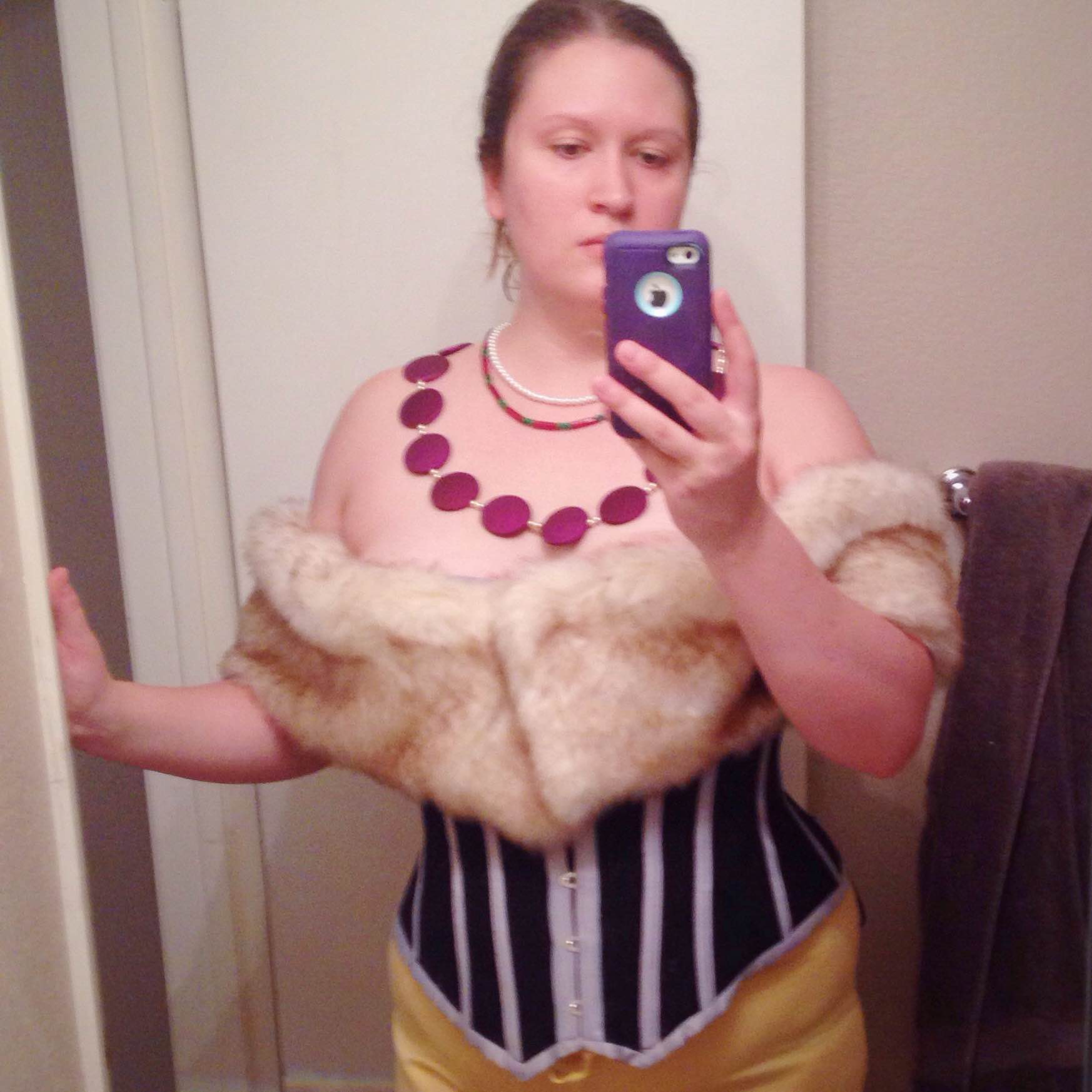 Fur, whether real or fake, is a tricky beast to work with. When cutting, it’s advisable to cut your piece from the wrong side of the fabric with a box cutter, taking care not to give your fur an inadvertent hair cut. This is also something to be mindful of when sewing. You’ll want to brush the fur away from your stitching and use a comb to release any fur that gets caught when you turn everything inside out. Have a vacuum and lint brush on hand to clean up when you finish! The stole attaches to my corset via hand-sewn snaps.