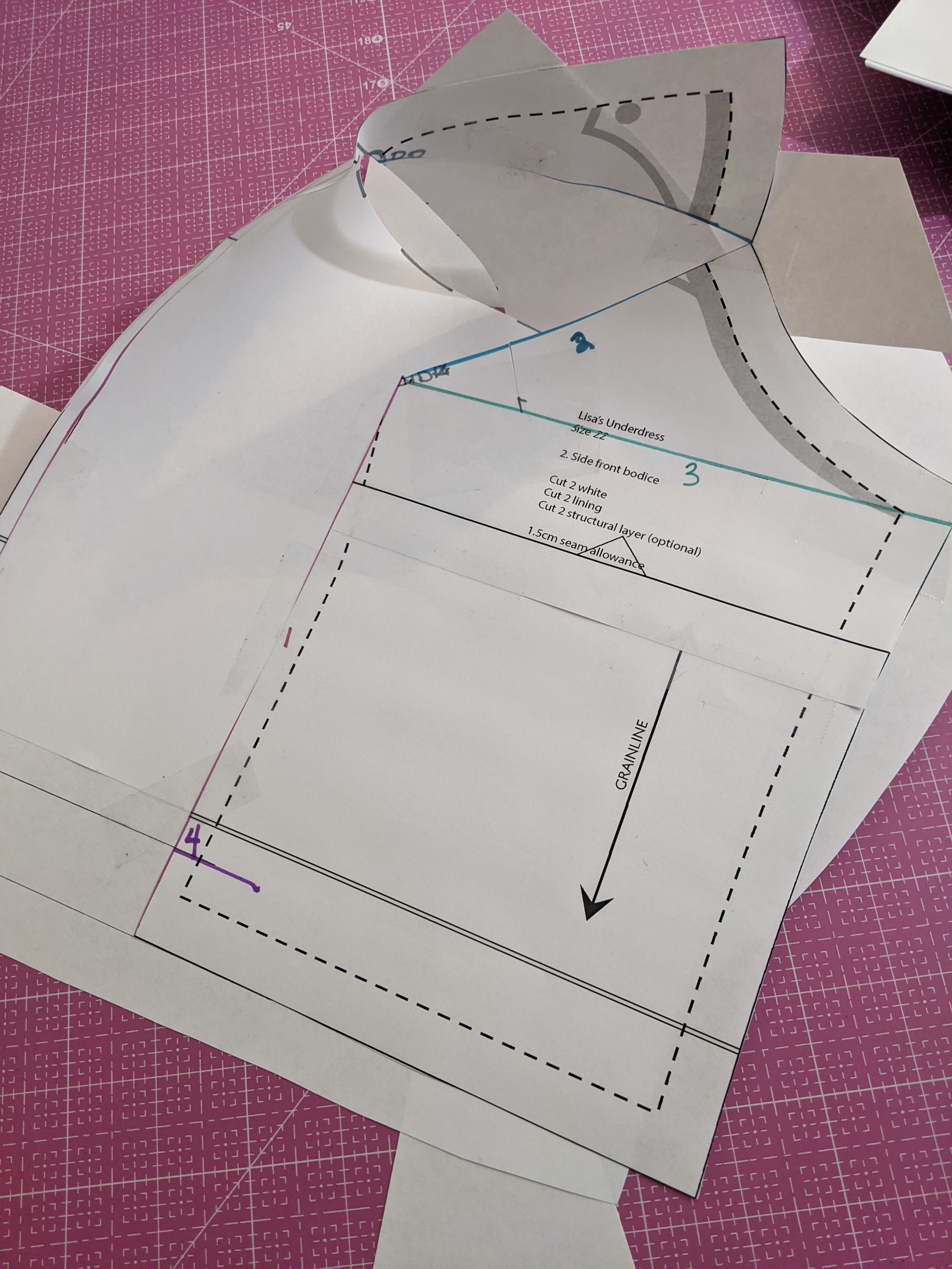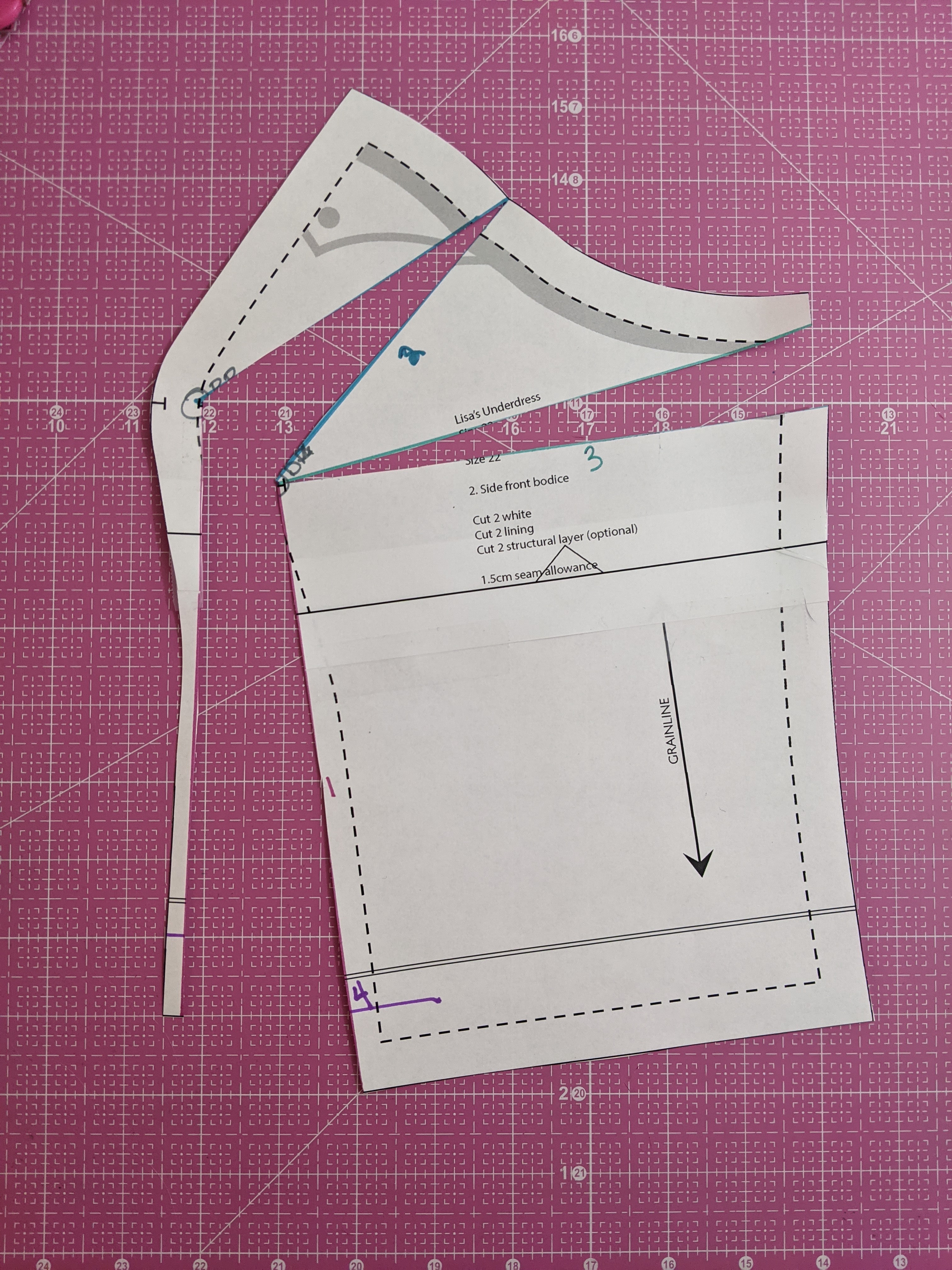 Line 2 can be a little weird with placement on a strapless bodice. I’ve overlaid this piece with another princess seam bodice from IndigoJinjo (her Garreg Mach uniform pattern) to show roughly here the armscye would go and why my line 2 is angled the way that it is.