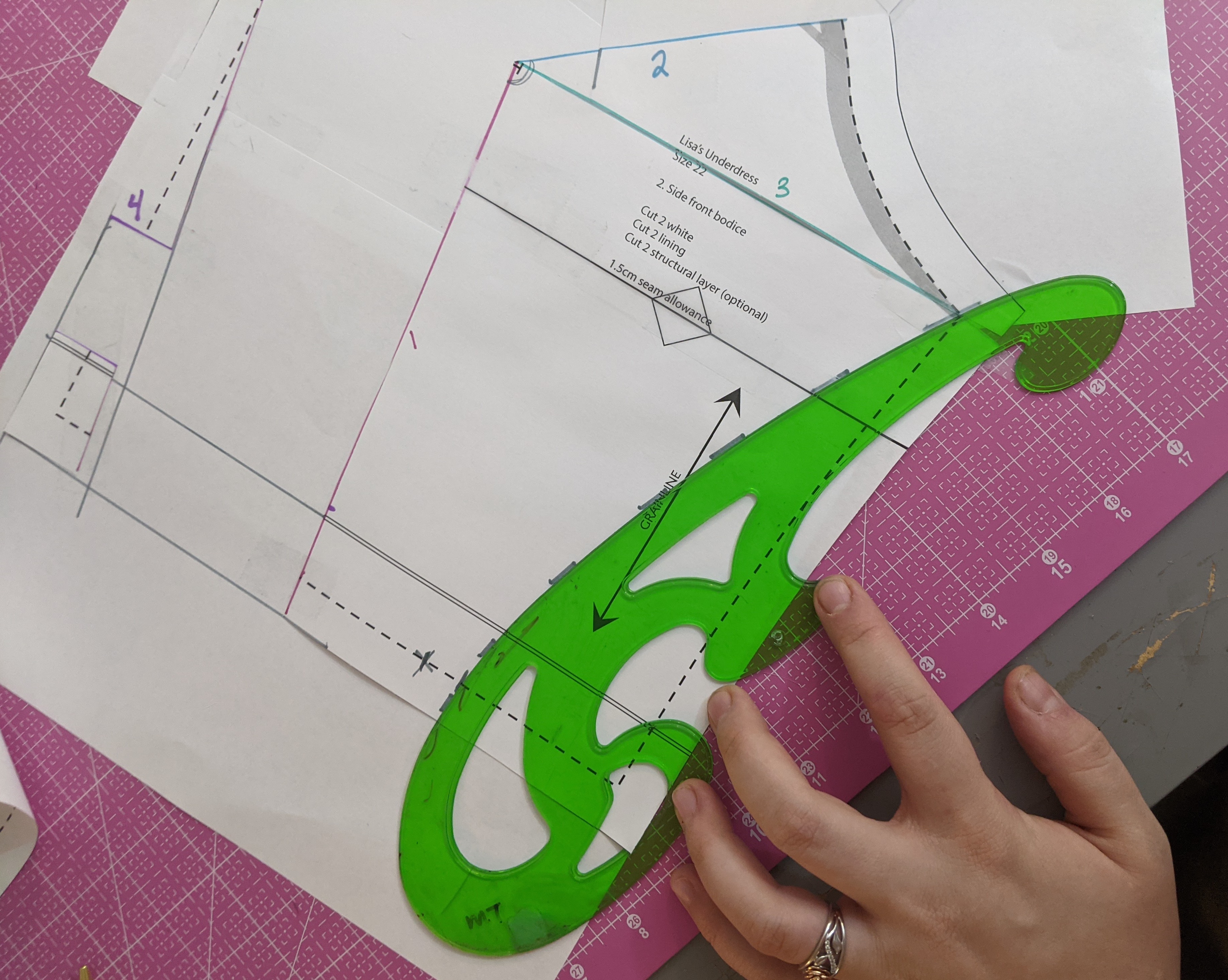 Using a curved tool (or freehand if you’re better at this than me), mark a line from the top of the side seam down to the mark you just made. Cut along this line and discard the excess.