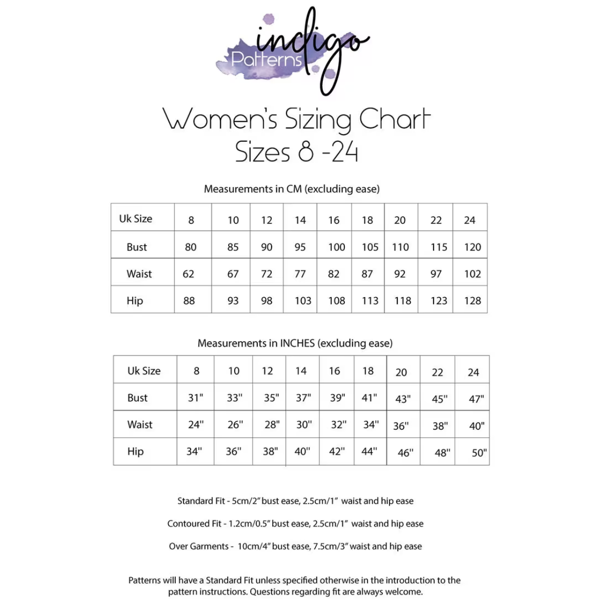 IndigoJinjo’s size chart for the Lisa pattern, pulled from her Etsy.