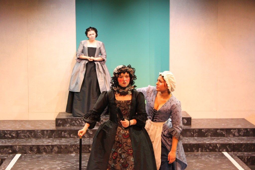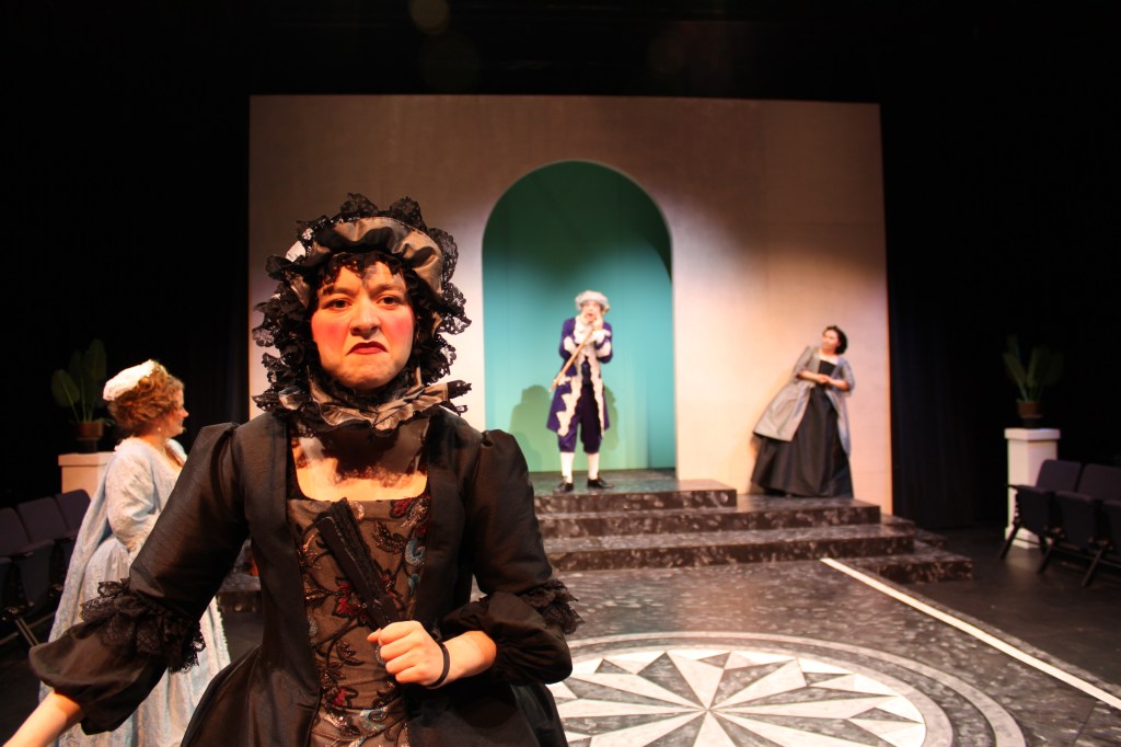 The director for our production opted to set the play in the early 18th century. French female silhouettes in the 1670s were set low and off the shoulder, which would have made it difficult for our actors to raise their arms. Our director wanted a very physical production, so we shifted the timeline to give us costumes with a bit more movement. Plus, Baroque. It’s fun.