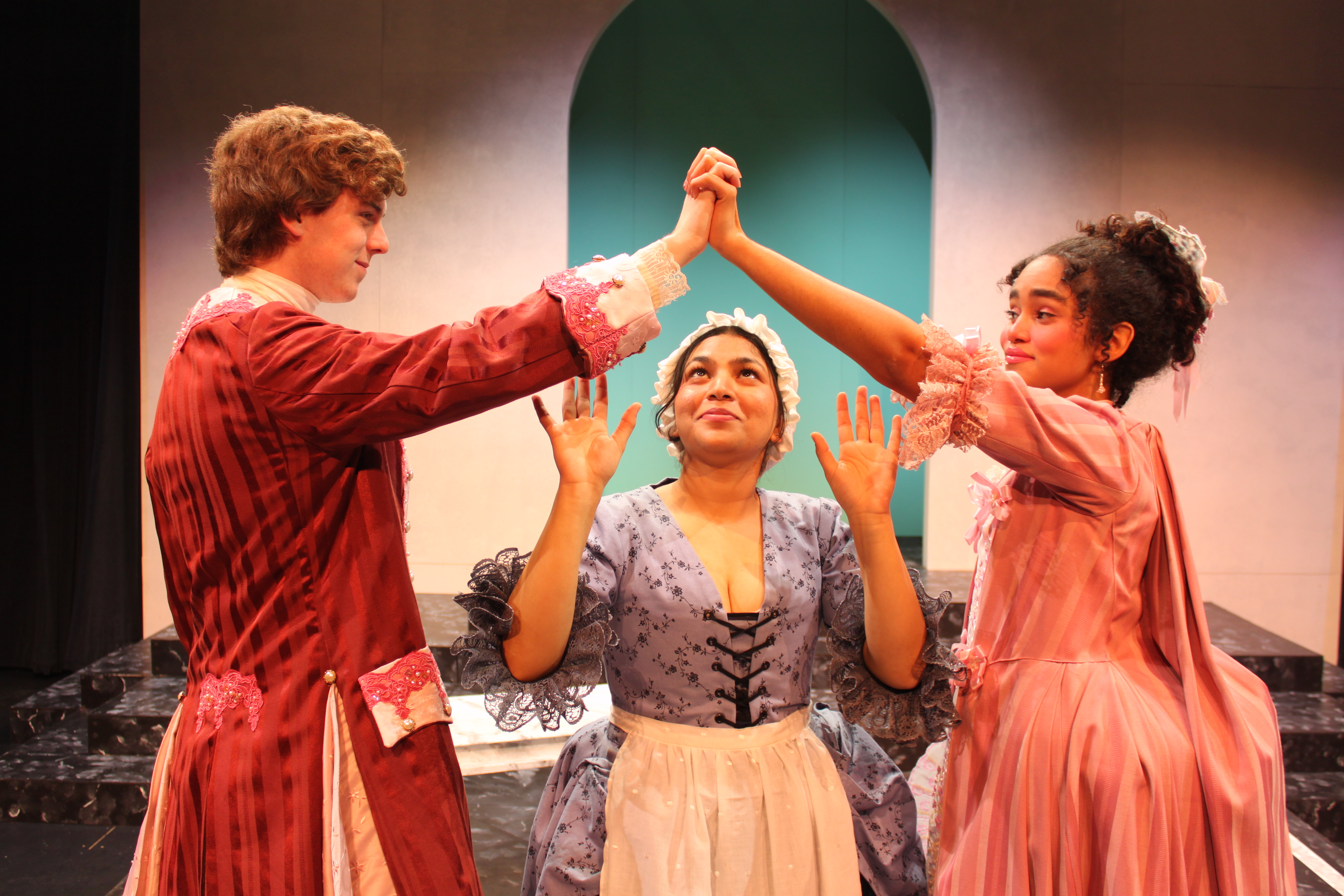 The director for our production opted to set the play in the early 18th century. French female silhouettes in the 1670s were set low and off the shoulder, which would have made it difficult for our actors to raise their arms. Our director wanted a very physical production, so we shifted the timeline to give us costumes with a bit more movement. Plus, Baroque. It’s fun.