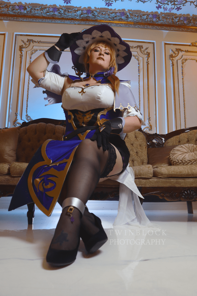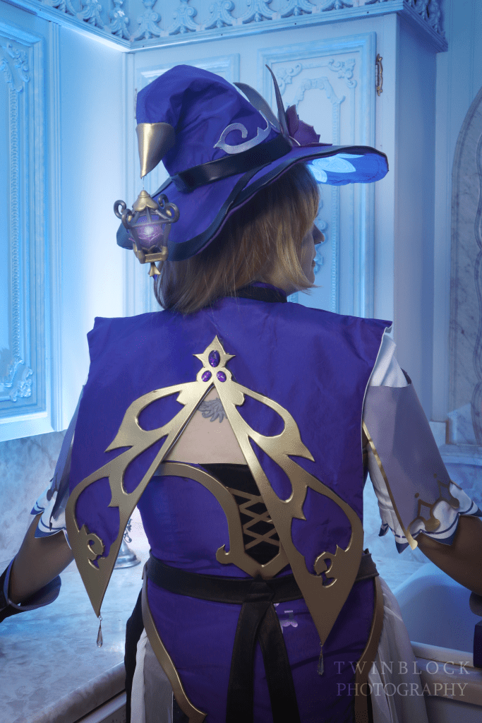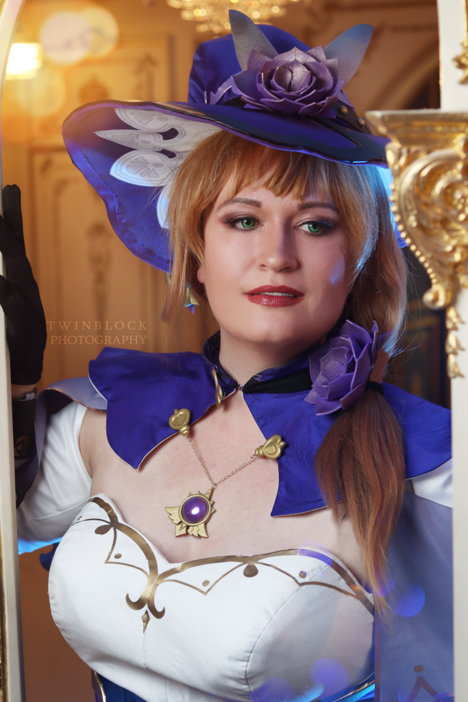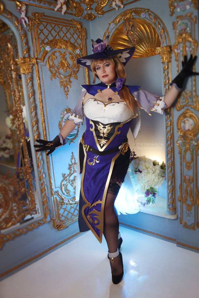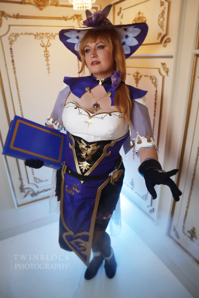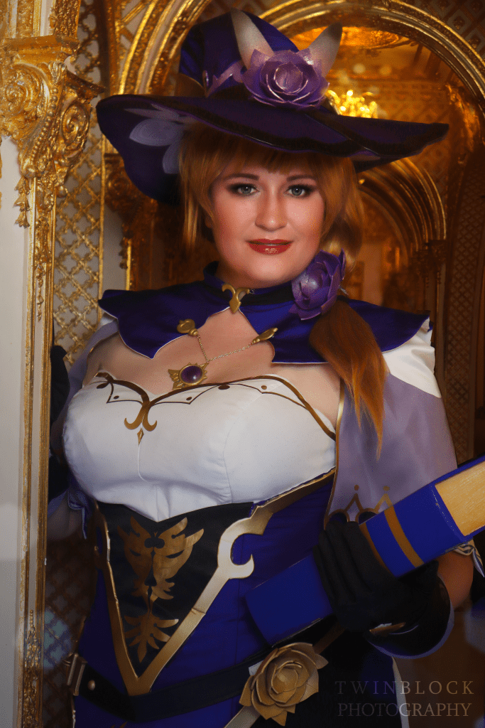 I have both Indigo Jingo and The Dangerous Ladies to thank for making this cosplay. I used Kirsty’s pattern and tailored it to fit my corseted measurements. A cupped corset is built into the base of this costume. I used The Dangerous Ladies’ resin kit for Lisa along with their printed fabrics for the hat lining. The resin kit was finished by me, and I put my airbrush to work to get a nice gold to match the dress trims.