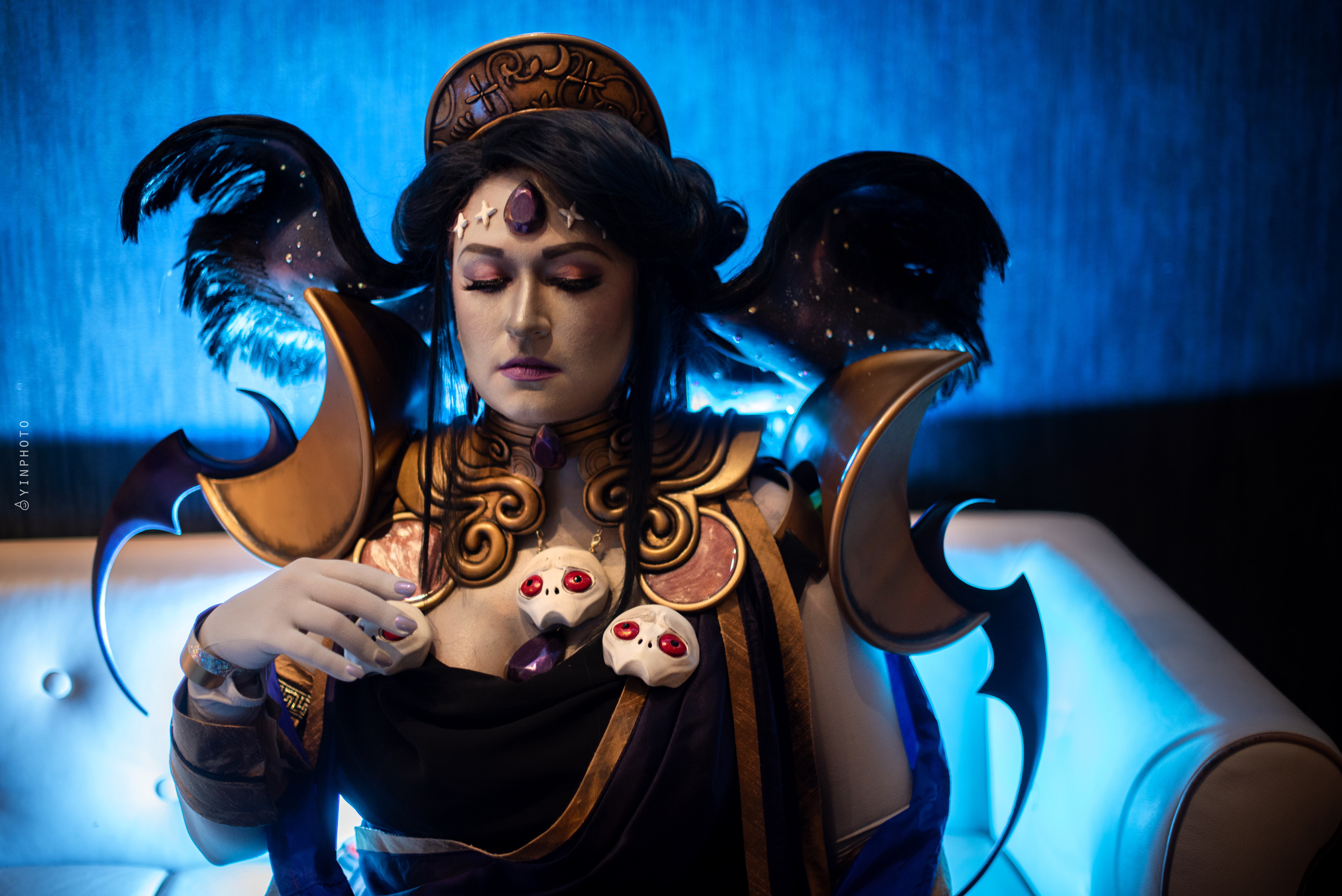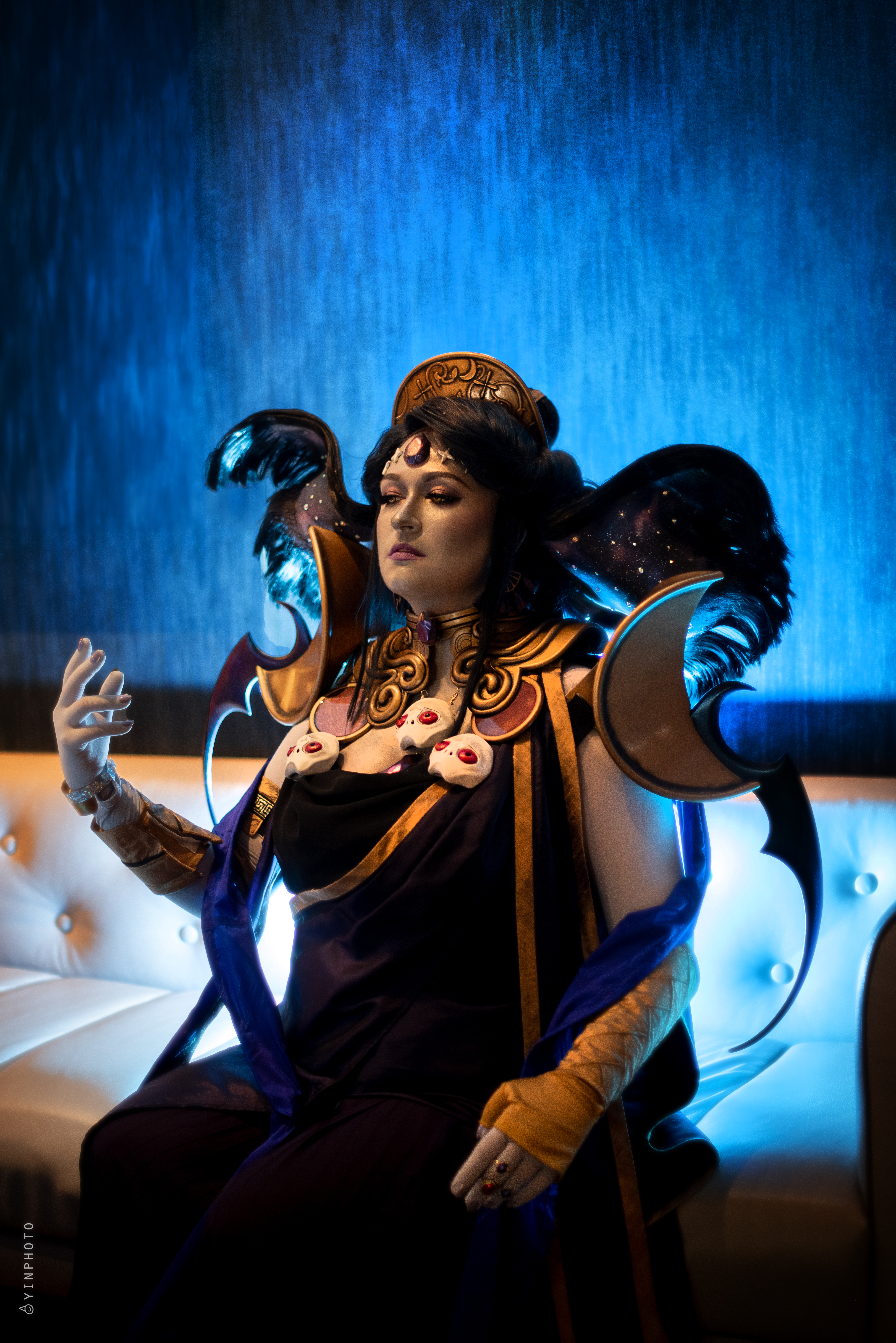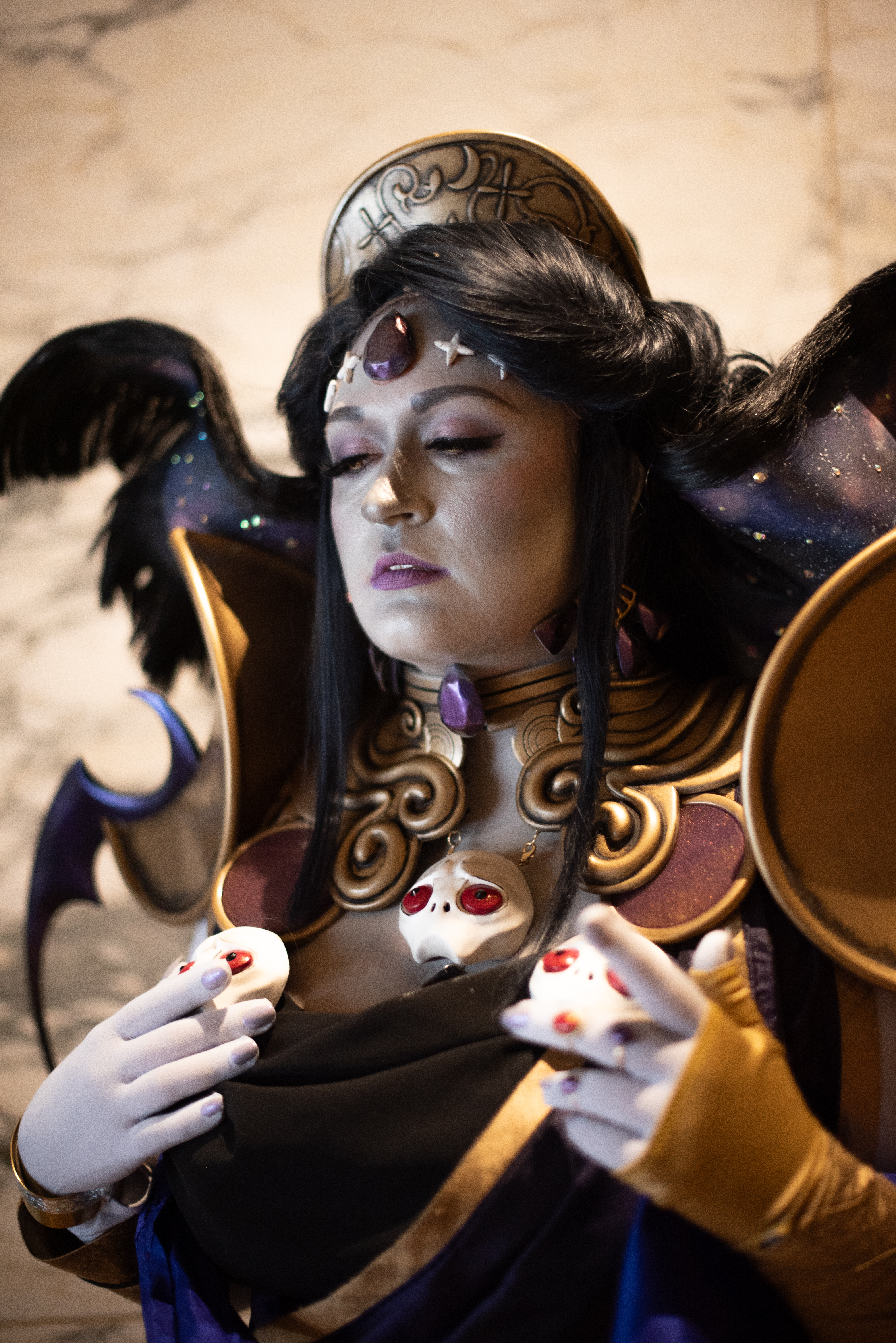 The wig was an absolute beast. I leaned heavily on MalindaChan’s Nyx tutorial for this one, so I won’t rehash too many details beyond what I did differently. For my base wigs, I dyed a base light blonde lace front wig black and then hand sewed wefts from an Arda Delilah for length. I wanted the batwing to lean into the galaxy vibes of the character art. The structure is made up of a translucent foam with fairy lights glued in, wire, and Worbla for additional support. Black felt is adhered on top of the Worbla to create a base to glue the wefts on. For the underside, I hand painted the galaxy design with acrylics and added rhinestones. Wefts were also glued around the edges to blend out the edges.