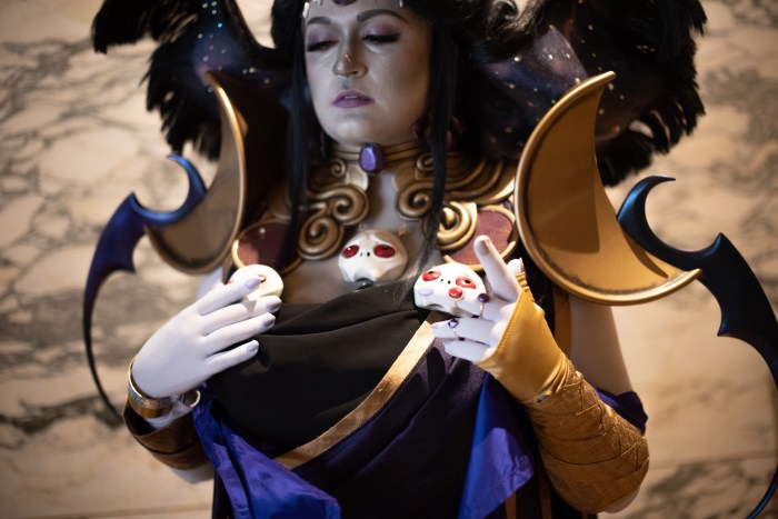 The wig was an absolute beast. I leaned heavily on MalindaChan’s Nyx tutorial for this one, so I won’t rehash too many details beyond what I did differently. For my base wigs, I dyed a base light blonde lace front wig black and then hand sewed wefts from an Arda Delilah for length. I wanted the batwing to lean into the galaxy vibes of the character art. The structure is made up of a translucent foam with fairy lights glued in, wire, and Worbla for additional support. Black felt is adhered on top of the Worbla to create a base to glue the wefts on. For the underside, I hand painted the galaxy design with acrylics and added rhinestones. Wefts were also glued around the edges to blend out the edges.